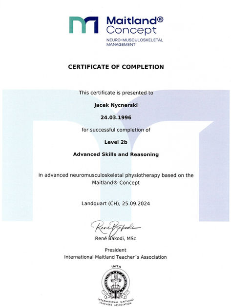 • Ukończenie kursu terapii manualnej wg. Koncepcji Maitland poziom IIb